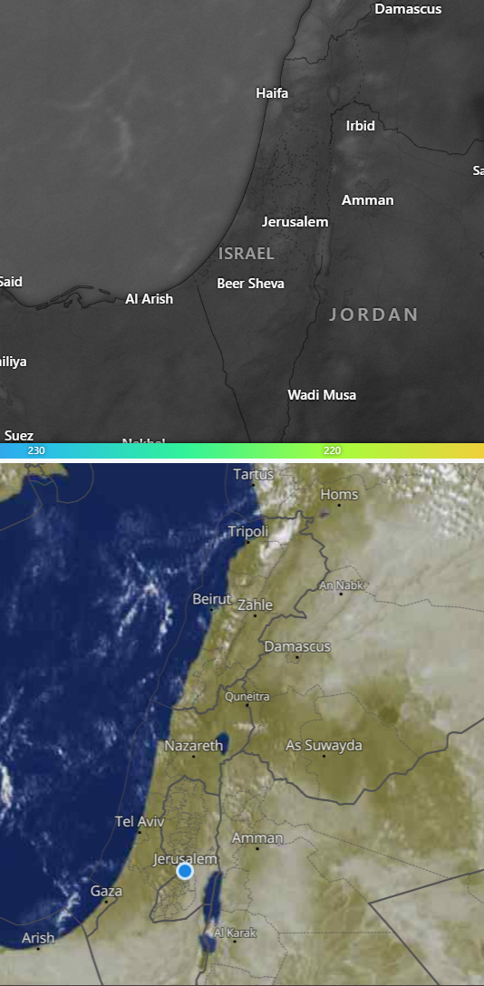 חזאי עוקב אחרי תנועת תצלומי הלווין בערוץ הנראה ובערוץ האינפרא אדום כדי לחזות את תנועת העננים בשעות הקרובות